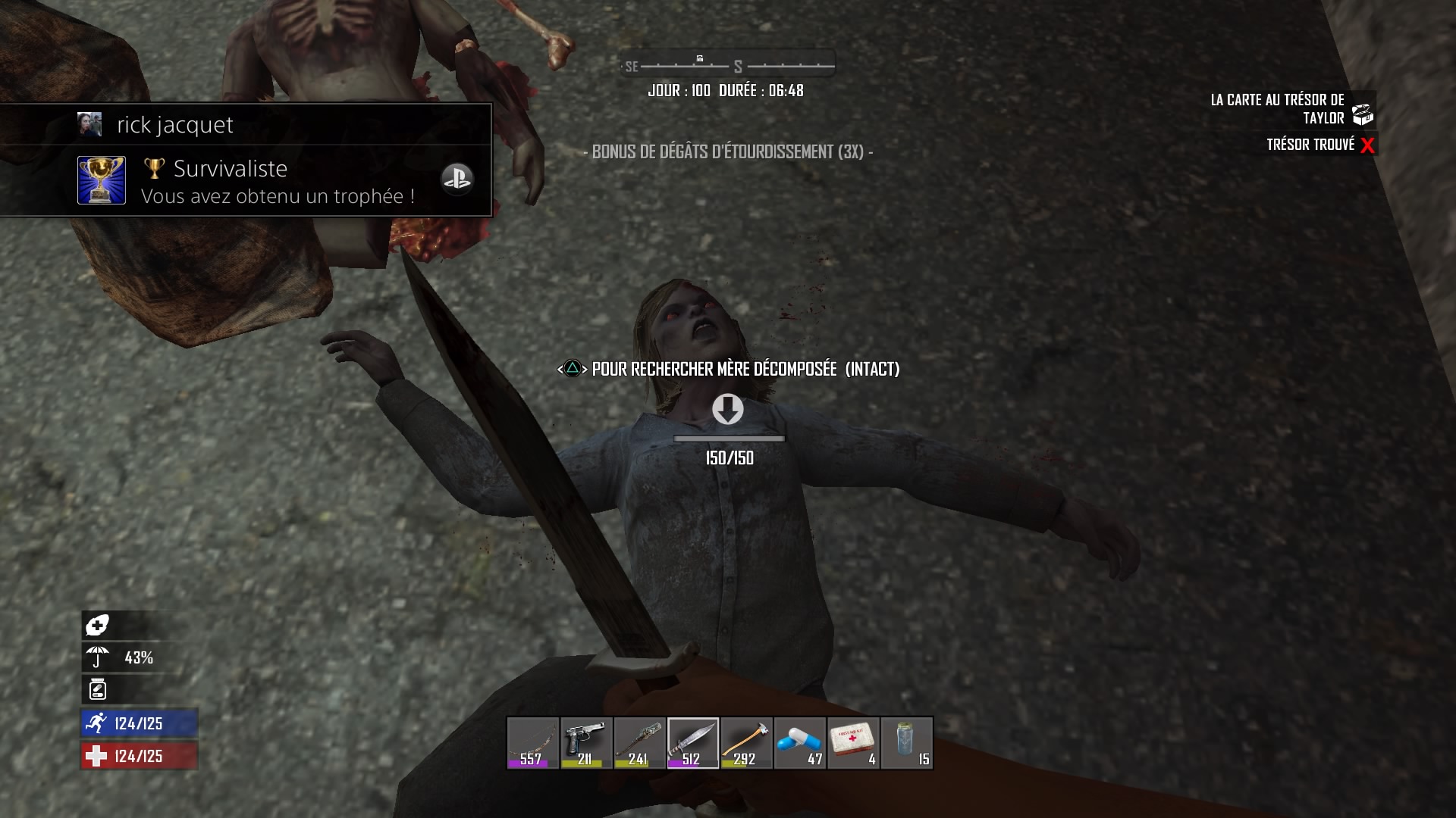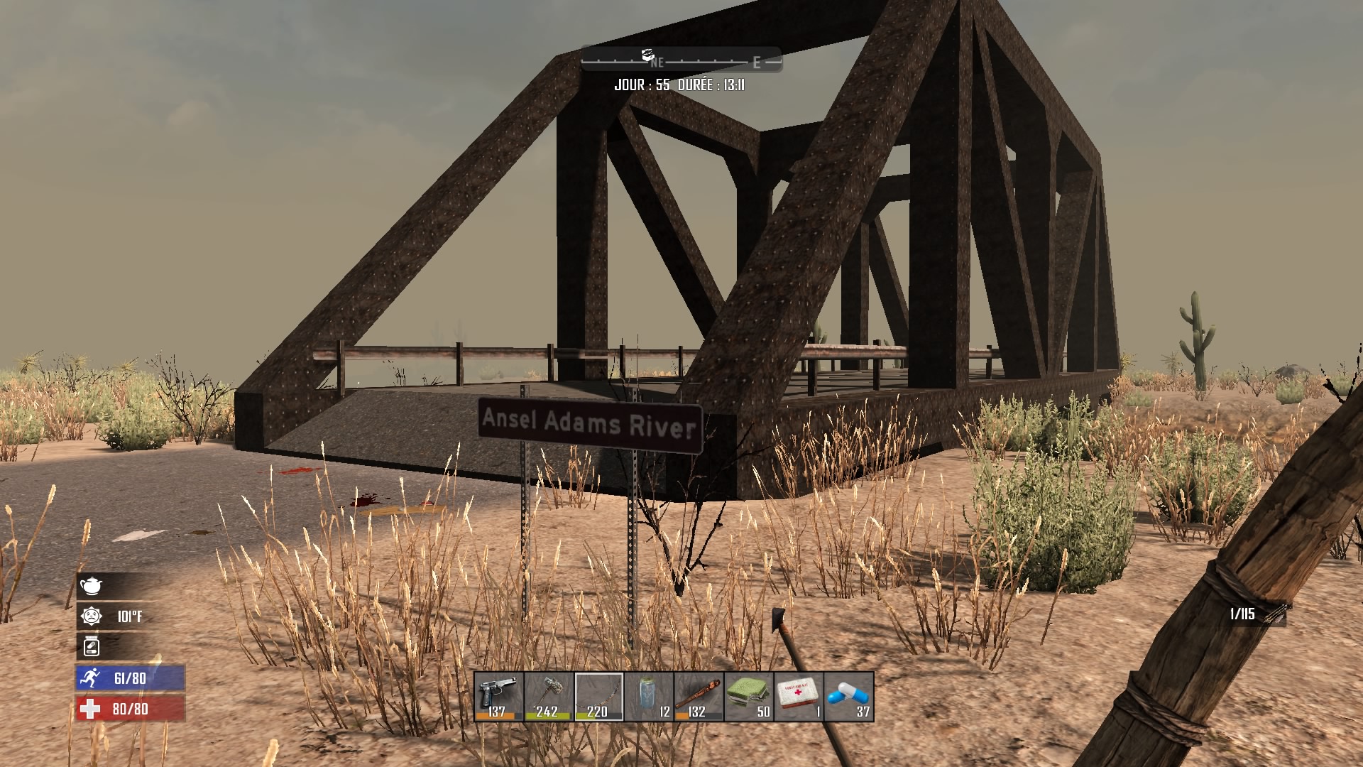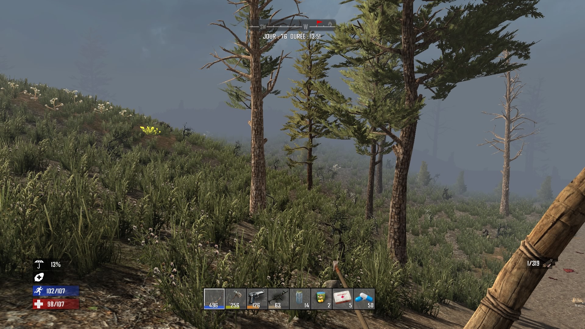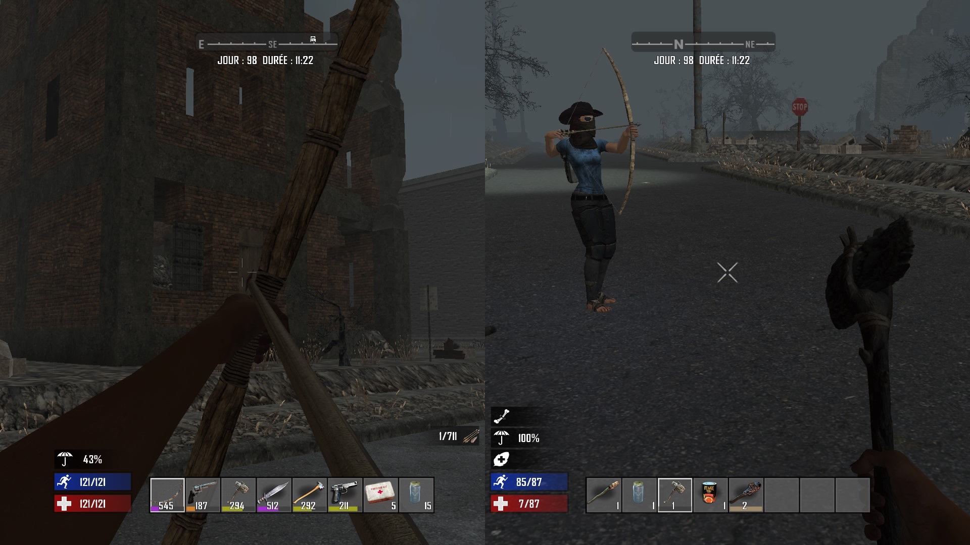 Ici, comme le titre nous l’indique, nous avons 7 jours. 7 jours pour se préparer, car tous les 7 jours, les zombies passent en mode furie nous dirons, et viennent nous attaquer peu importe l’endroit où l’on se trouve. Donc pendant 7 jours, on se ballade, on prépare des pièges, on fortifie sa base, sans oublier bien entendu de surveiller les parachutages de provisions en tout genre aux alentours de midi (ce qui peut nous donner des trousses de soin, ou des schémas pour apprendre à construire des choses fort utiles, ou à réparer des objets). Puis on part un peu en forêt avec l’arc pour chasser le cerf et récupérer de la viande que l’on fera cuire au feu de camp, en faisant attention aux ours. On explore la map, immense, puis on fait attention à rentrer chez nous avant 22h, tombée de la nuit où les zombies deviennent plus féroces et courent. 7 jours relativement simples, avant la chasse, ce moment plus difficile si l’on a un abri tout pourri ! (ce qui, vous l’avez compris, n’est plus mon cas). Et plus les jours avancent, plus l’on survie, plus l’on augmente son bien être (ce qui augmente notre vie et notre endurance), plus le jeu devient sadique, en nous mettant des zombies plus forts, avec de nouvelles attaques. Et même UN OURS ZOMBIE qui m’aura fait la peau alors que je rentrais tranquillement chez moi en plein après-midi ! Enfer et damnation !
