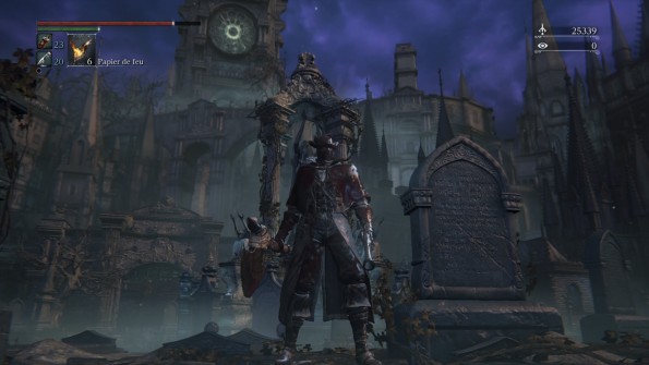 Et autant dire que face à la concurrence actuelle, une telle difficulté, une telle plongée dans un univers si différent du notre, et bien ça fait du bien ! Et du coup, on essaye, on meurt, on recommence, on insiste, on tue quelques ennemis faciles juste pour augmenter son niveau, et là, quand on arrive finalement à passer le passage qui nous bloquait, c’est un sentiment de supériorité et de victoire qui nous gagne ! Et ces instants, on en a des tas dans Bloodborne, si bien que oui, on galère, on meurt, mais on prend un plaisir limite malsain à avancer, tant l’univers qui nous entoure nous captive et nous happe littéralement. C’est bien simple, c’est sublime, et parfois tellement simple que ça en devient encore plus beau. Oui, les PNJ sont rares, la plupart, lorsque l’on frappe à leur porte, nous demandent gentiment de dégager. Et c’est ainsi que lorsque l’on pourra échanger ne serait-ce que deux phrases avec une poupée dans le rêve du chasseur, l’on pourra y trouver un peu de réconfort. Qu’elle ne fut ma surprise lorsqu’en revenait dans le rêve, j’ai trouvé la poupée au sommet des tombes, en train de prier pour que je revienne vivant de la chasse. Simple, anecdotique, mais suffisant pour rendre tel ou tel élément prenant et attachant.