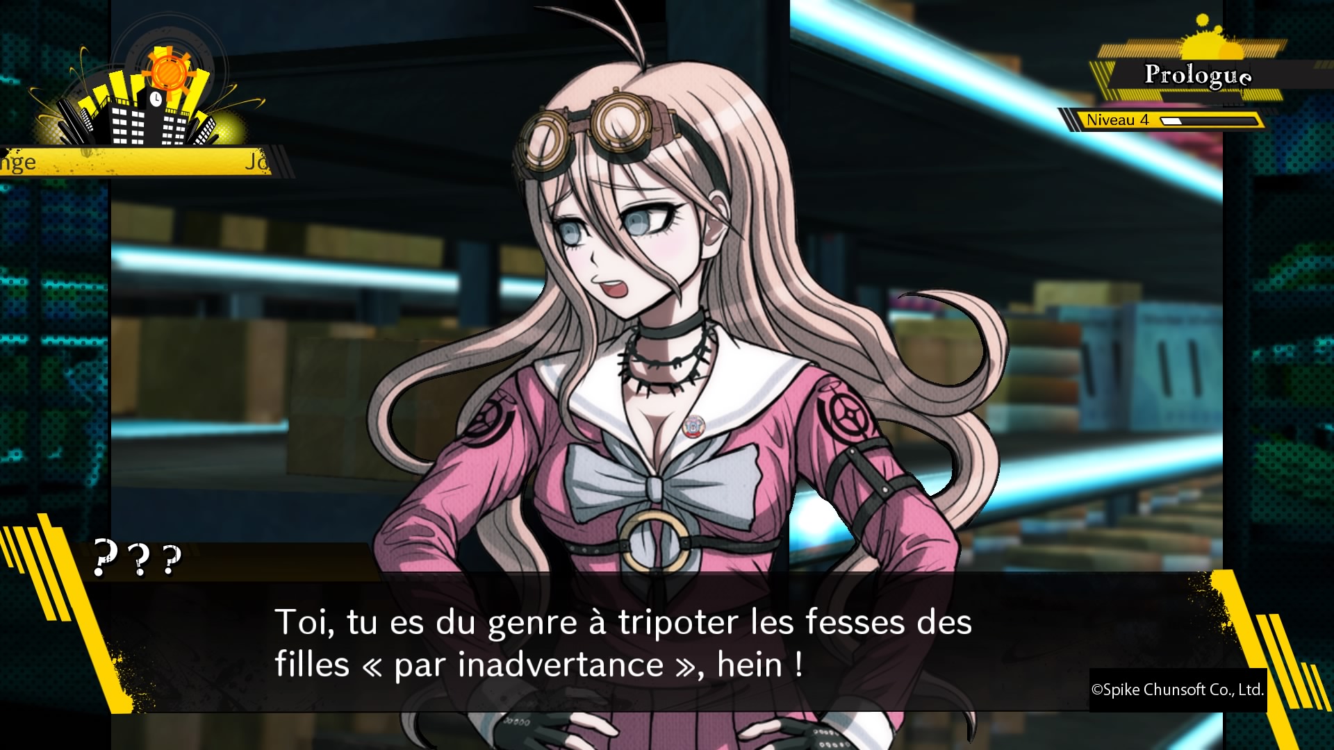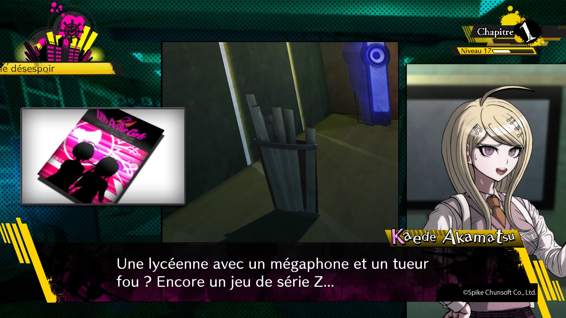 Oui, que ce soit Miu, l’inventrice vulgaire mais peu sûre d’elle, la gamine Himiko et sa magie… pardon, sorcellerie (je ne voudrais pas la vexer), Maki qui se révèle au compte goutte, Gonta l’amoureux des insectes, Kaito l’astronaute qui positive toujours, ou même Kokichi, ils ont tous un background, une personnalité propre et complexe. Seule Angie, l’ultime artiste, m’aura par moment énervé, avant de voir là un thème rarement exploité à ce point dans la saga, ce qui prouve encore une fois que derrière ses délires, Danganronpa parle de sujets on ne peut plus vrai. Outre les questionnements habituels sur la vie, la mort, la valeur de la vie bien entendu, l’amitié, d’autres thèmes s’invitent dans la partie, comme la religion et même parfois d’autres thèmes graves. Et même, petit clin d’œil actuel sans doute, la réalité virtuelle. Oui, Danganronpa V3 (le V a une signification je rassure) est une réussite au niveau de ses personnages et de ses thèmes abordés. Comme dit plus haut, le jeu se divise en trois parties, et dans chaque chapitre, l’impensable se produit, un meurtre a lieu, et le jeu bascule alors en mode en quête où l’on devra récolter des indices. Rien de nouveau ici, la formule est la même depuis le premier jeu. Notons d’ailleurs qu’ici, la difficulté a semble-t-il été revu à la baisse, un point d’exclamation étant sur votre carte pour indiquer dans quelles pièces se situent les indices, au cas où un indice serait passé dans les mailles de votre filet.