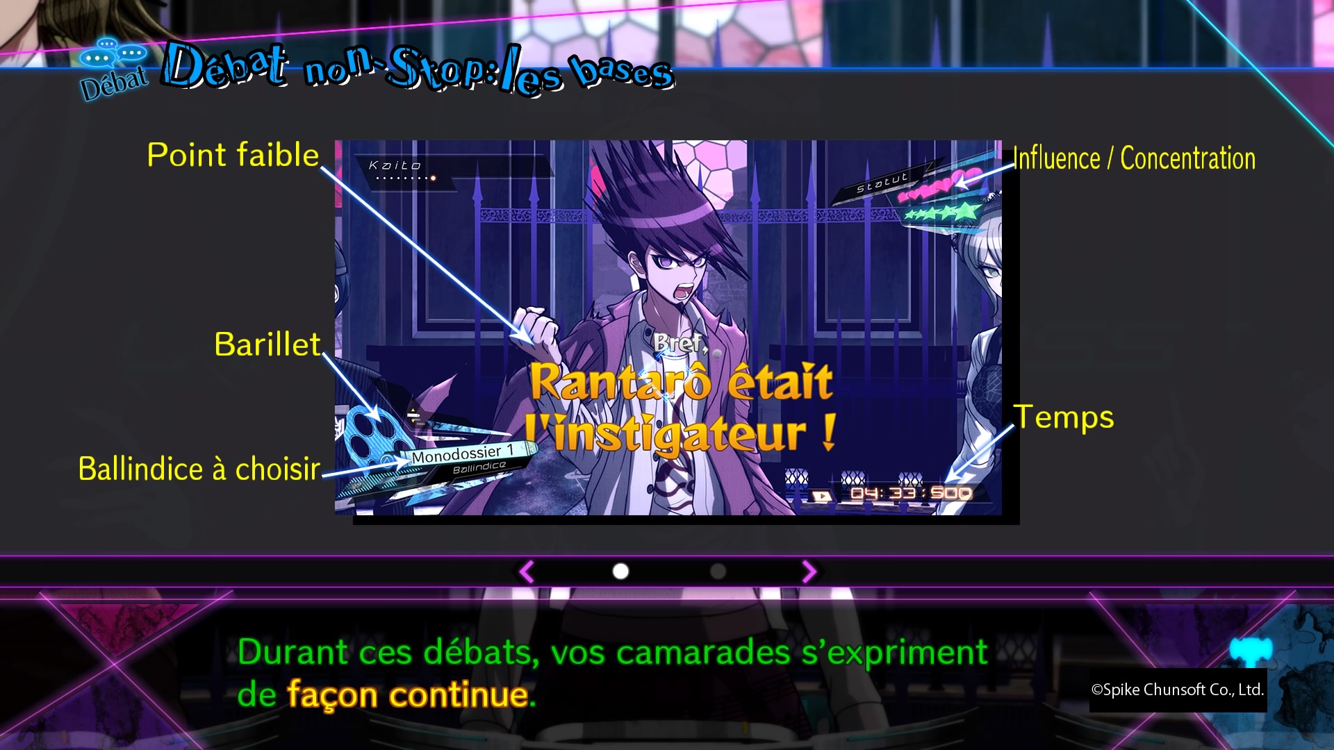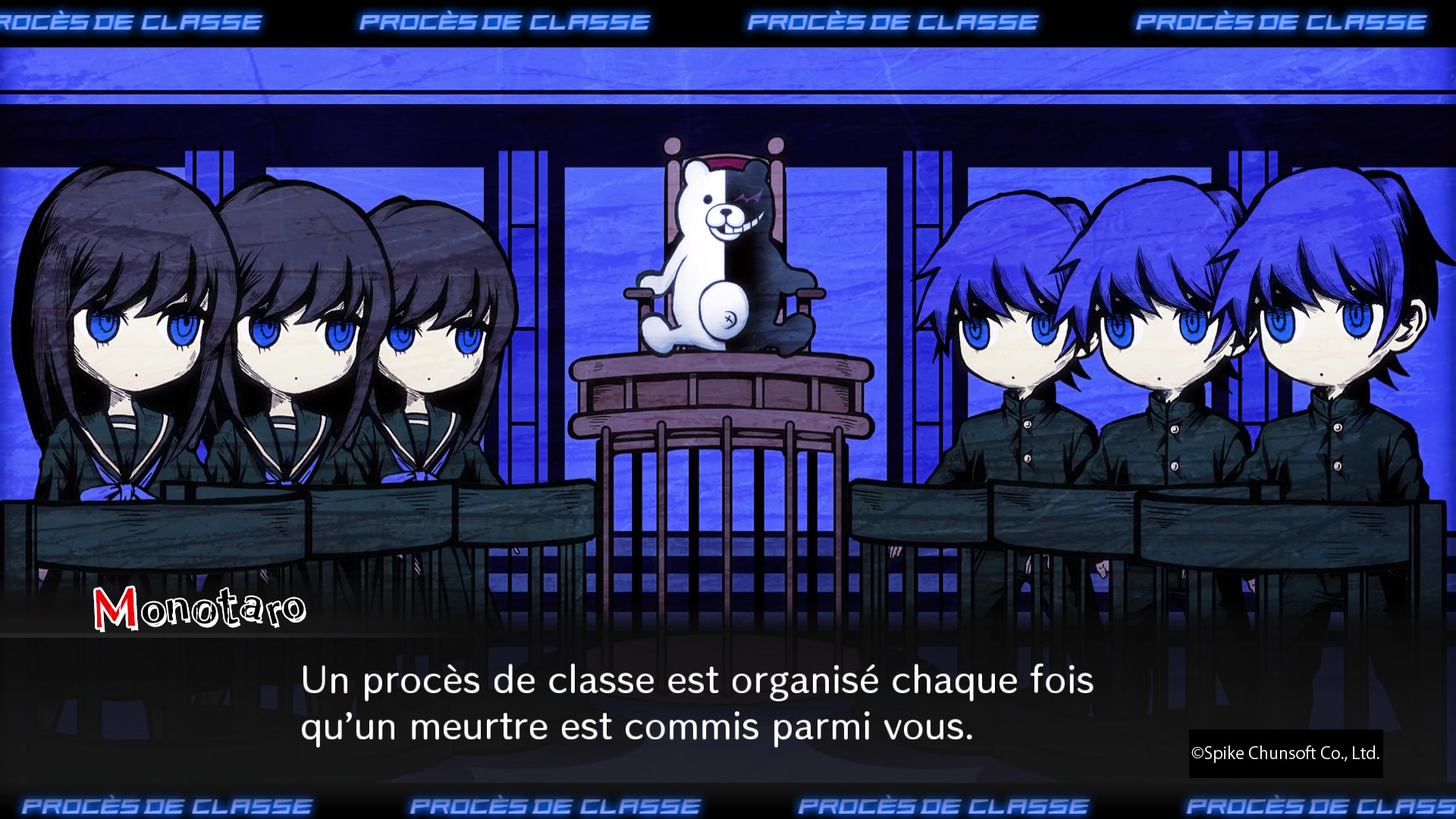 Encore une fois, l’aventure découpée en six chapitres plus un prologue et un épilogue nous présente 16 étudiants. Seize nouveaux étudiants aux dons divers, la crème de la crème, enfermés dans un lieu pour participer à une tuerie organisée par Monokuma. Cette fois-ci, ça ira de l’ultime pianiste, que le joueur joue, à l’ultime tennisman, l’ultime nounou, l’ultime créatrice, l’ultime magicienne et j’en passe. Pour mixer un peu l’ambiance du premier jeu et celle un peu plus ouverte du second jeu, le lieu de l’action sera de nouveau une école, mais l’on pourra également aller dans le jardin, changer de bâtiment, explorer un peu les alentours. Dans sa forme, on retrouve donc parfaitement l’univers des deux premiers jeux. À savoir une structure découpée en trois parties, avec de nombreux petits ajouts par-ci par-là pour ne pas donner l’impression que l’ensemble se répète. On passe ainsi de la vie ordinaire, où l’on va explorer l’école en vue subjective et en 3D, parler à nos 15 autres camarades de classe pour approfondir un peu leur background, ou même aller dans certains lieux pour participer à des mini jeux. Puis lorsqu’un cadavre est découvert, nous passons à la phase d’enquête, où il va falloir chercher les indices, parler à nos camarades/témoins/coupables potentiels pour mieux s’en sortir dans la troisième phase de gameplay, à savoir les procès, où l’on va débattre non stop et participer à des petits jeux pour mettre à jour le mode d’exécution du meurtre et bien entendu l’identité du coupable.