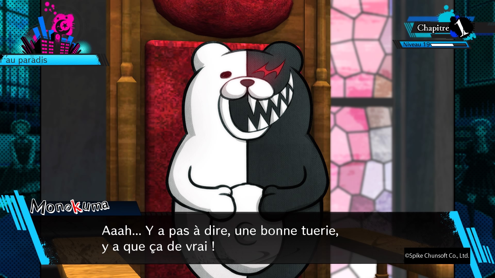 Ah Danganronpa ! Pour ceux qui lisent mes tests de jeux, vous savez que quelques sagas me tiennent à coeur, et en général, ce ne sont pas les sagas grand public. Oui, il y a bien Silent Hill, mais bon, ça date maintenant. Non, j’adore les Yakuza par exemple, et les Danganronpa ! Une saga qui a une place particulière dans le cœur des fans, un visual novel lancé en 2010 au Japon et qui a su rapidement se trouver des fans grâce à ses qualités d’écriture, son univers alliant glauque, grotesque et humour noir, et grâce à un de ses personnages. Oui, Monokuma, l’ours en peluche totalement psychopathe, adepte de l’humour noir et des exécutions graphiques et WTF. Et depuis la sortie du premier opus, il y a eu du chemin de parcouru. Danganronpa était la surprise, Danganronpa 2 poussait la formule plus loin (par moment trop loin), Ultra Despair Girls changeait la formule pour être un TPS se déroulant entre les deux premiers jeux. Puis pour la suite de l’aventure, il fallait se tourner vers Danganronpa 3, la série d’animation de 24 épisodes, faisant à la fois office de suite au deuxième jeu que de préquelle au premier jeu. Oui, l’univers est dense, l’univers est travaillé, et depuis le temps, nous avons appris à aimer les personnages, qu’ils soient du côté de l’espoir ou du désespoir pour cette lutte éternelle jonchée de cadavres et d’éclaboussures de sang rose ! Mais l’équipe allait-elle faire aussi fort avec ce nouvel opus, le nommé Danganronpa V3 Killing Harmony ? Un opus oubliant le côté TPS pour revenir à la base, le visual novel, les enquêtes, les procès de classe. Un épisode qui fait clairement suite aux précédents, mais qui nous emmène (tardivement donc je ne dirais rien) vers de nouveaux horizons. Un épisode qui si il ne renouvelle rien dans le fond, fait bien les choses et ose par moment insérer de nouvelles choses dans un concept déjà bien rodé pour le plaisir des joueurs. Petite analyse, sans spoilers.