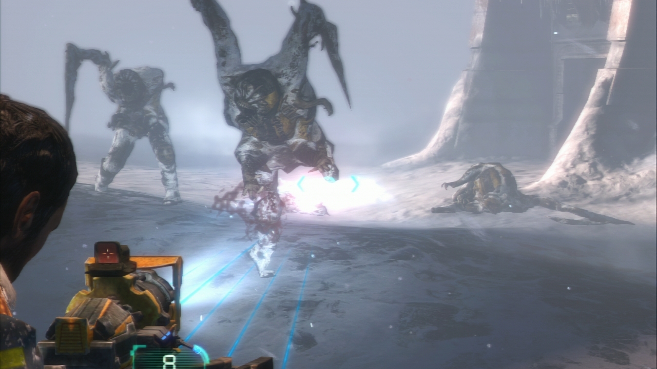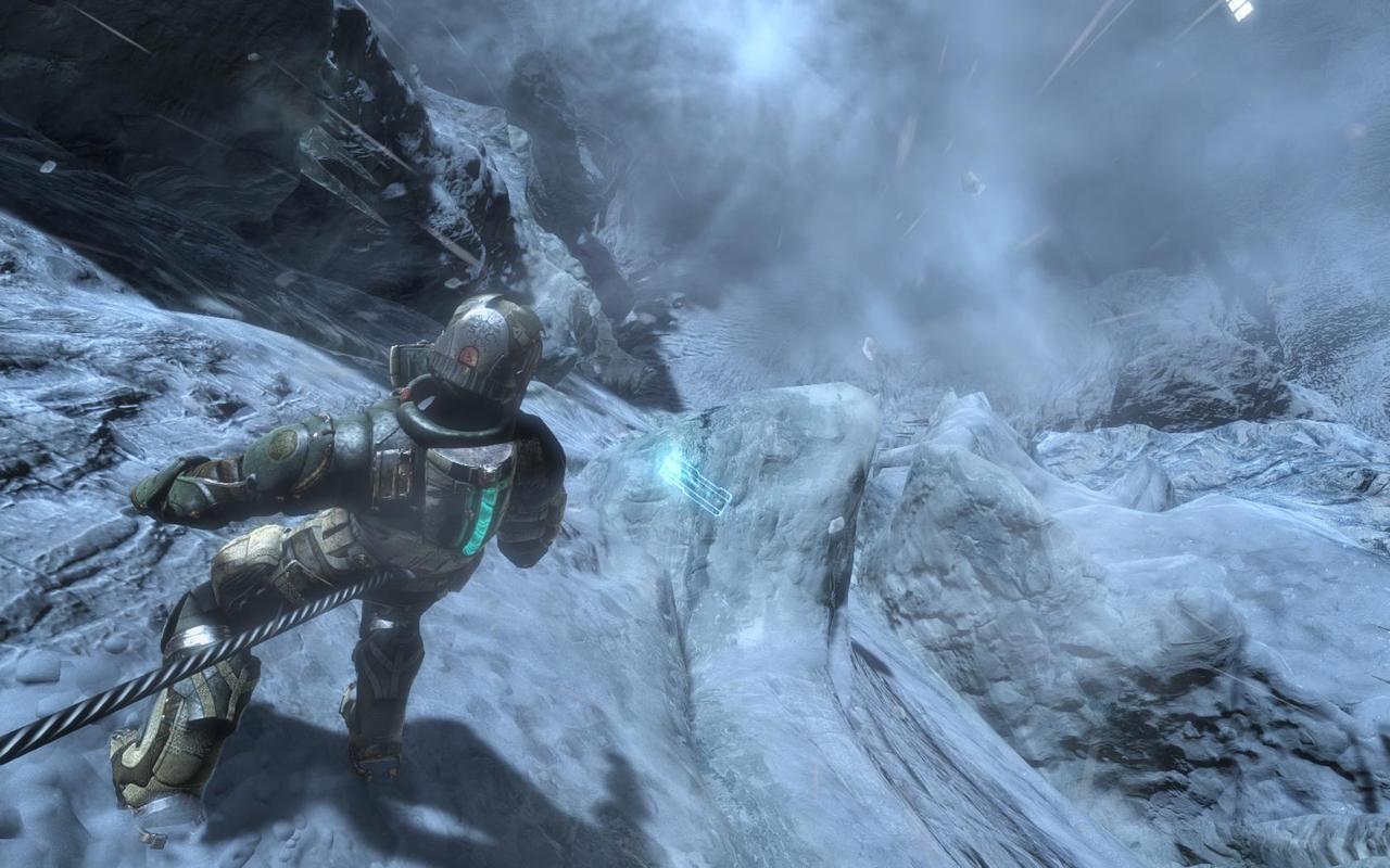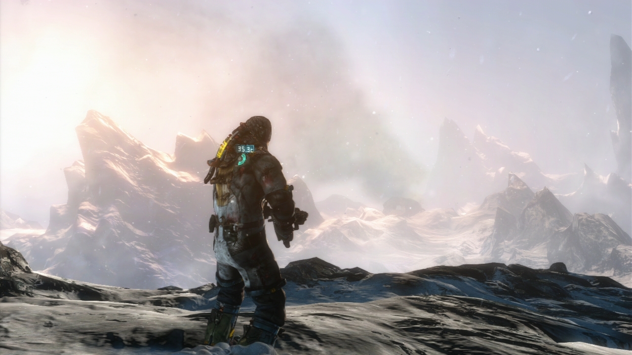 Et ne parlons pas du grand méchant, plutôt inutile au final, et parlant le plus souvent pour ne rien dire. Bref, oui, Dead Space 3 s’est bien foiré sur son écriture. Et ça fait mal, car à côté de ça, il nous propose également de bonnes choses, et surtout donc, des environnements oh combien sublimes. On passera sur la première partie du jeu dans des vaisseaux, de longs couloirs, ce qui rappelle bien évidemment les deux premiers opus, puisque cela n’apporte rien de réellement nouveau, à part, allez soyons fou, la capacité pour Isaac de s’accroupir… Super hein ? Non, ne soyons pas mauvaise langue. Avant cette première partie, le jeu nous offre un prologue d’environ 40 minutes, se déroulant sur la fameuse planète de glace (et où l’on ne joue pas Isaac), qui nous montre déjà la nouvelle direction du titre. Et c’est encore une fois dommage car on discerne ce qui aurait pu être d’excellentes idées. Avancer dans une tempête de neige, échapper à des éboulements, ouais, la classe. Puis après trois minutes dans la neige à suivre finalement l’unique chemin disponible, on arrive en intérieur, et là, on avance, on tire, on avance et on tire. Puis on retrouve Isaac pour continuer ce prologue, posant les bases. Norton nous envoie en mission, le grand méchant nous menace et active un Monolithe, et on doit sauver notre peau en partant sur Tau Volantis (oui, la fameuse planète de glace).