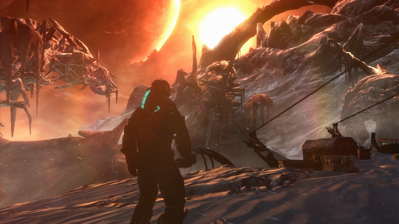 On est déçu en affrontant souvent des humains (oui, Dead Space 3 prend des allures de banal TPS), et pourtant, certaines scènes ont clairement de la gueule. Avancer dans des bureaux vides en voyant par les baies vitrées un Monolithe activé qui plonge la ville dans un monde apocalyptique (et éclairé en rouge), ça a de la gueule. Puis l’action revient, et on arrive à la première partie, qui ne fait que reprendre la formule des deux premiers opus. À savoir des petits couloirs, quelques jumpscares, des QTE de plus en plus envahissants (l’effet Resident Evil 6 ?) et des scènes sans gravités. Rien de véritablement innovant, mais la formule est juste reproduite et amplifiée, la peur en moins. Et pourtant, à certains moments, le jeu capte clairement notre attention. Les scènes sans gravitées par exemple, où on évolue parmi des débris dans l’espace, ont plutôt de la gueule et sont prenantes, et nous gratifie en plus d’une bande son oh combien influencée par Alien. Trop influencée peut-être, mais je pardonne, j’aime beaucoup les musiques souvent glauques de Jason Graves (Until Dawn, Tomb Raider le reboot, FEAR 3). Puis changement de décors, nous sommes enfin sur la planète.