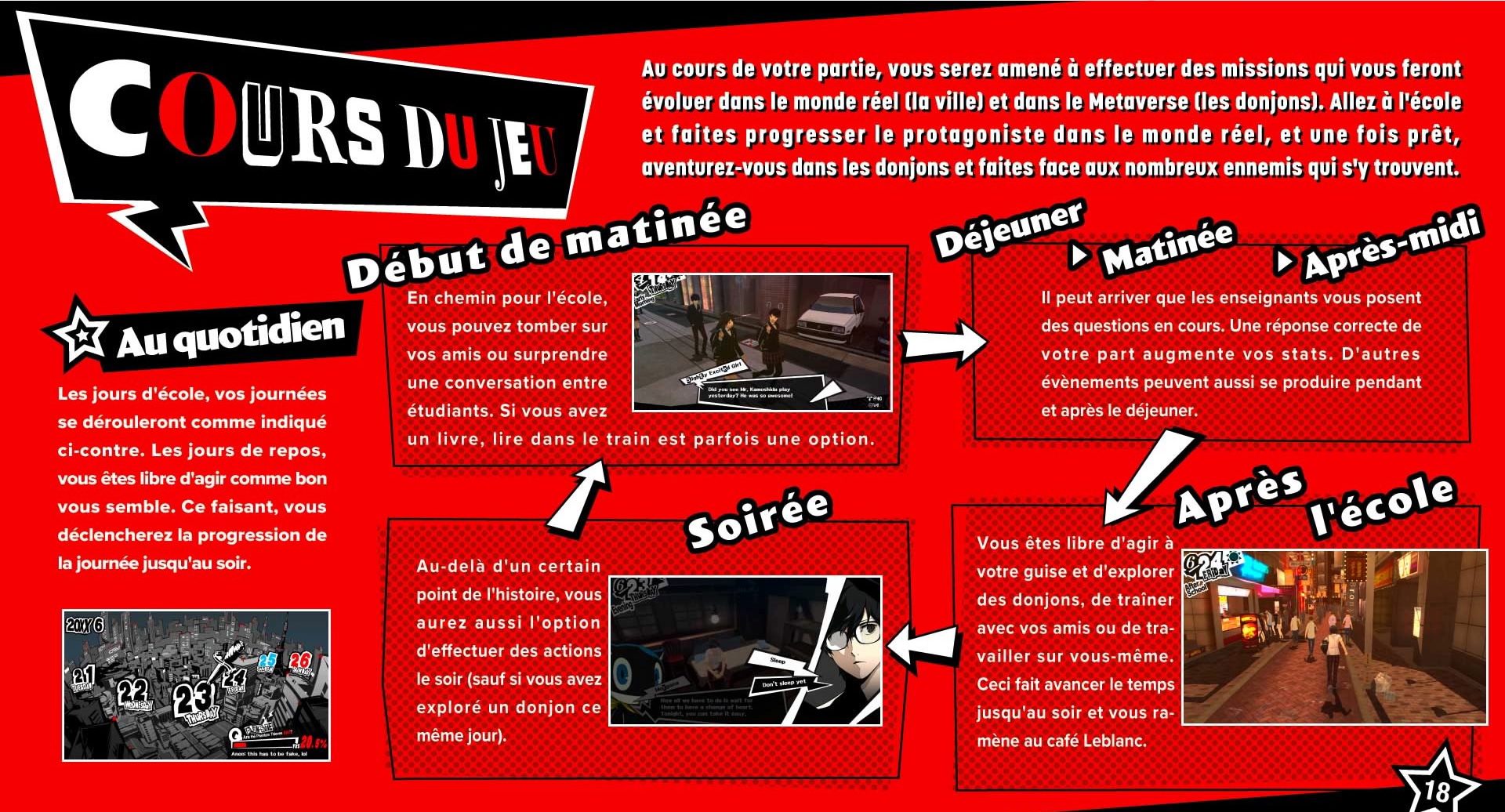 Simple, Persona 5 nous met dans la peau d’un jeune lycéen au nom de notre choix. Dans un style graphique nous faisant penser à Catherine, nous découvrons le personnage, doté d’un masque, essayant de s’évader d’un casino, mais se faisant arrêter par la police si près de son but. Interrogé par une jeune femme, nous voilà enfin dans le vif du sujet. Des mois plus tôt, en Avril, notre personnage arrive à Tokyo, où il doit passer un an suite à un petit souci de justice. Comme je l’ai dit plus haut, les premières heures du jeu sont là pour nous apprendre les nombreuses mécaniques de gameplay. Gérer notre temps, de la matinée jusqu’au coucher, chaque jour, durant de longs mois. Et ne vous inquiétez pas, des activités, il y en a dans Persona 5, et si pas mal de ses activités sont optionnelles, au final, une activité pourra améliorer une de nos compétences, ce qui débloquera l’accès à une mission secondaire, ce qui pourra par exemple donner un coup spécial à un personnage. Si bien qu’au final, même s’il est possible (et triste) de finir Persona 5 en ligne droite (une ligne droite de 100 heures malgré tout hein), l’ensemble est tellement passionnant que l’on voudra y passer des heures et des heures, tout fouiller de fond en comble, tout tester, travailler dans de nombreuses boutiques, parler à tout le monde, apprendre toutes les compétences. Persona 5 nous balance dans un monde semi ouvert donc, et notre personnage va devoir alterner entre vie quotidienne et donjons, ici appelés palaces. L’élément déclencheur ?