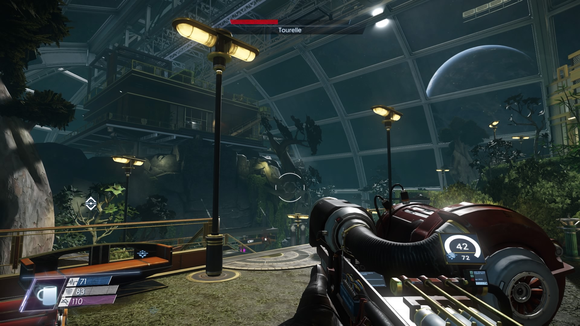 Apprendre deux capacités aliens fera apparaître le « cauchemar », un ennemi énorme qui va nous chasser pendant 3 minutes. Idée excellente, même si au final, en sachant bien gérer sa façon de jouer, pas si dangereuse que ça. Par contre, apprendre trop de capacités aliens fera que toutes les tourelles du jeu vont nous attaquer, ne nous considérant plus comme humain. Le gameplay est donc varié et passionnant, mais qu’en est-il du reste ? En soit, l’histoire de Prey est assez classique par contre, mais cela ne veut pas dire qu’elle est mal écrite, loin de là. L’ensemble se suit avec plaisir, et le scénario pourra dévier en fonction de nos choix. Va-t-on choisir d’écouter January ou le tuer ? Va-t-on aller à l’encontre de notre frère, ou l’aider dans sa quête ? Ou tout simplement tout laisser en plan pour prendre une navette de secours ? L’histoire est intéressante et ses différentes fins plutôt amusantes, à défaut de toutes totalement convaincre. Plus haut, je vous parlais de level design, et des possibilités qui donnaient à Prey une bien bonne saveur. À côté de ça, Arkane nous fournir un univers bien pensé et une direction artistique de toute volée. Et heureusement, car si le jeu n’est pas moche, certaines textures piqueront les yeux, pour de vrai. La végétation notamment, si l’on s’en approche un peu trop, prendra l’apparence de vieux pixels bien grossiers. Inégal donc, même si dans l’ensemble, tout à fait correct. Encore une fois, la direction artistique, la variété des lieux et l’ambiance générale font le boulot.