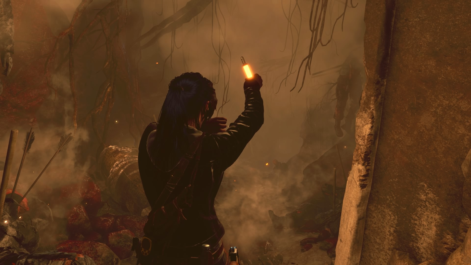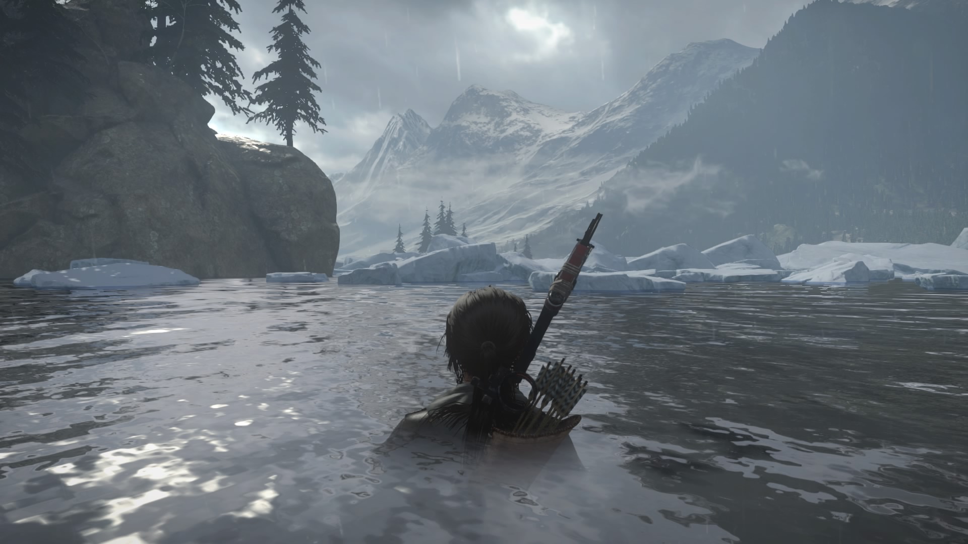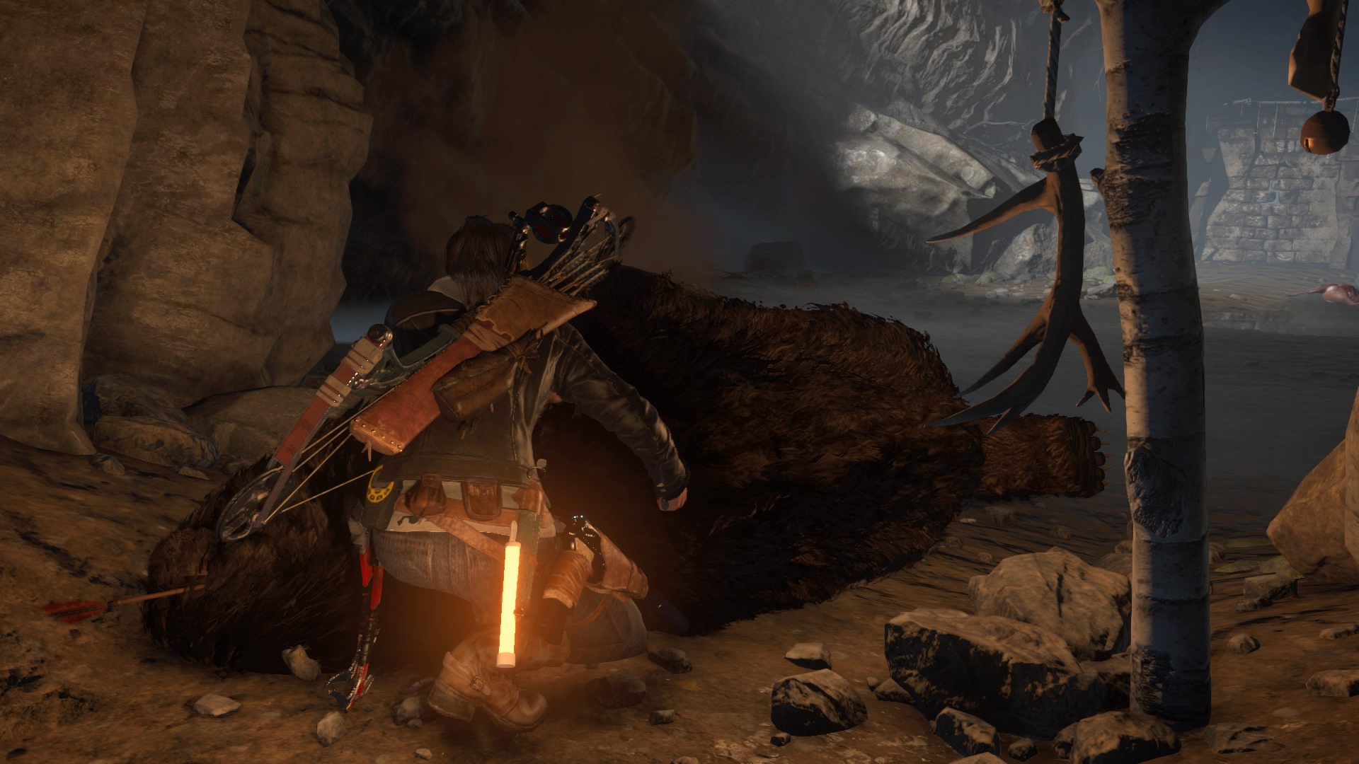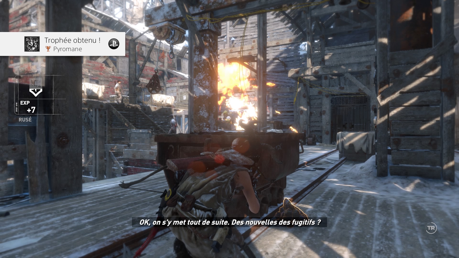 Le désert, les ruines, le sable, la poussière, puis 15 minutes après (et une évasion d’un lieu ancien que l’on fait misérablement exploser), finit la Syrie, et le jeu se déroulera intégralement en Sibérie. Dommage. Mais bon, la Sibérie, c’est beau, surtout sous la neige. Mais avant de parler du gros défaut de l’œuvre outre son manque d’identité, parlons des ajouts. Ceux-ci sont peu nombreux, et Crystal Dynamics n’a jamais poussé à fond les éléments qui auraient mérités de l’être, comme par exemple la survie. Quand on commence véritablement le jeu, seul, perdus, il fait froid, il faut prendre des forces et chasser, comme dans le premier, avec l’arc. Une idée encore une fois intéressante, mais qui passé ce passage, ne servira à rien, à part pour récupérer de la fourrure et améliorer des armes donc. Les développeurs ont ajoutés des prédateurs dans la forêt, et malheureusement, à part quelques loups que l’on croisera par hasard (et une fois, je suis tombé nez à nez avec un jaguar ou un truc du genre), ces prédateurs se limiteront à deux passages obligatoires, avec un ours, puis avec un Lynx. Limité donc. Dans le même ordre d’idée, notons l’ajout de la neige, qui par endroit sera plus profonde, et Lara ne pourra donc pas courir, ni sauter ou faire de roulades. Ce qui peut être gênant quand un ours nous poursuit. Mais ces moments sont encore une fois peu nombreux. Sinon dans les ajouts intéressants mais arrivant tardivement, on pourra noter l’ajout du grappin, qui rappellera des souvenirs aux vieux joueurs, ainsi qu’un couteau de chasse, permettant de nouvelles éliminations silencieuses et de couper des cordes. Les tombeaux facultatifs sont de retour, et les développeurs ajoutent à cela des missions secondaires, très simples. Parler à un PNJ, aller soit ramasser un objet, soit tuer des ennemis, retourner parler au PNJ, et à nous l’expérience.