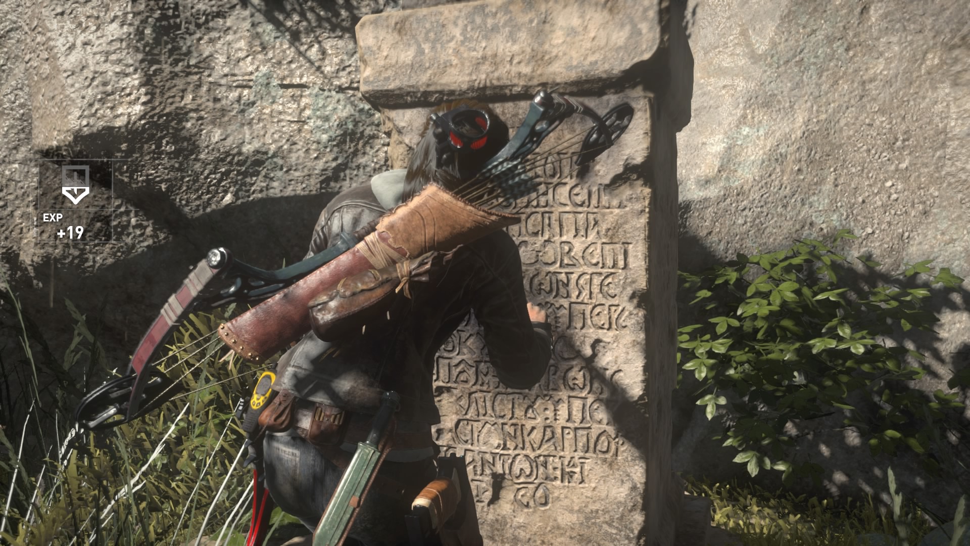 Les développeurs ajoutent aussi une nouveauté dans notre « vision ». Vous savez, cette touche qui permet de mettre en avant les éléments interactifs et ceux à ramasser. Ici, ils ajoutent une couleur pour les ennemis. S’ils apparaissent en jaune, on peut les descendre sans crainte. S’ils apparaissent en rouge, cela signifie qu’un autre ennemi non loin de là l’a dans son champ de vision, et l’éliminer nous fera repérer. Sinon, Rise of the Tomb Raider est une copie conforme du précédent. Plusieurs zones (forêt, montage, grotte, village, vestiges) bourrées d’éléments à ramasser (documents, reliques), bourrées d’ennemis qui sont toujours aussi cons. Car oui, parlons en des défauts. Son manque d’identité et de nouveautés, on en a déjà parlé, passons à l’IA des ennemis. Et bien, ils sont cons, c’est simple. Ils se cachent, lancent des grenades si vous vous cachez, et courent droit vers vous pour que vous aligniez bien vos tirs. Cachez vous dans un buisson et vous pourrez tous les éliminer tranquille. La difficulté du jeu n’est pas bien compliqué déjà, mais avec une IA pareille. Le jeu ne va pas vous demander de bien réfléchir, à part dans les tombeaux facultatifs, et si la difficulté n’est pas bien élevée, ces passages font clairement plaisir. Mais autre grand défaut, l’écriture du titre en question. Pas sa mise en image, très Hollywoodienne et impressionnante, mais son écriture en elle-même. Car les différents acteurs doublant (et prêtant leurs traits aux personnages, comme Camilla Luddington pour Lara) font du très bon boulot, du moins dans la version originale (je n’ai jamais tenté la VF), mais il y a néanmoins un gros décalage entre le texte et ce que le joueur doit faire.