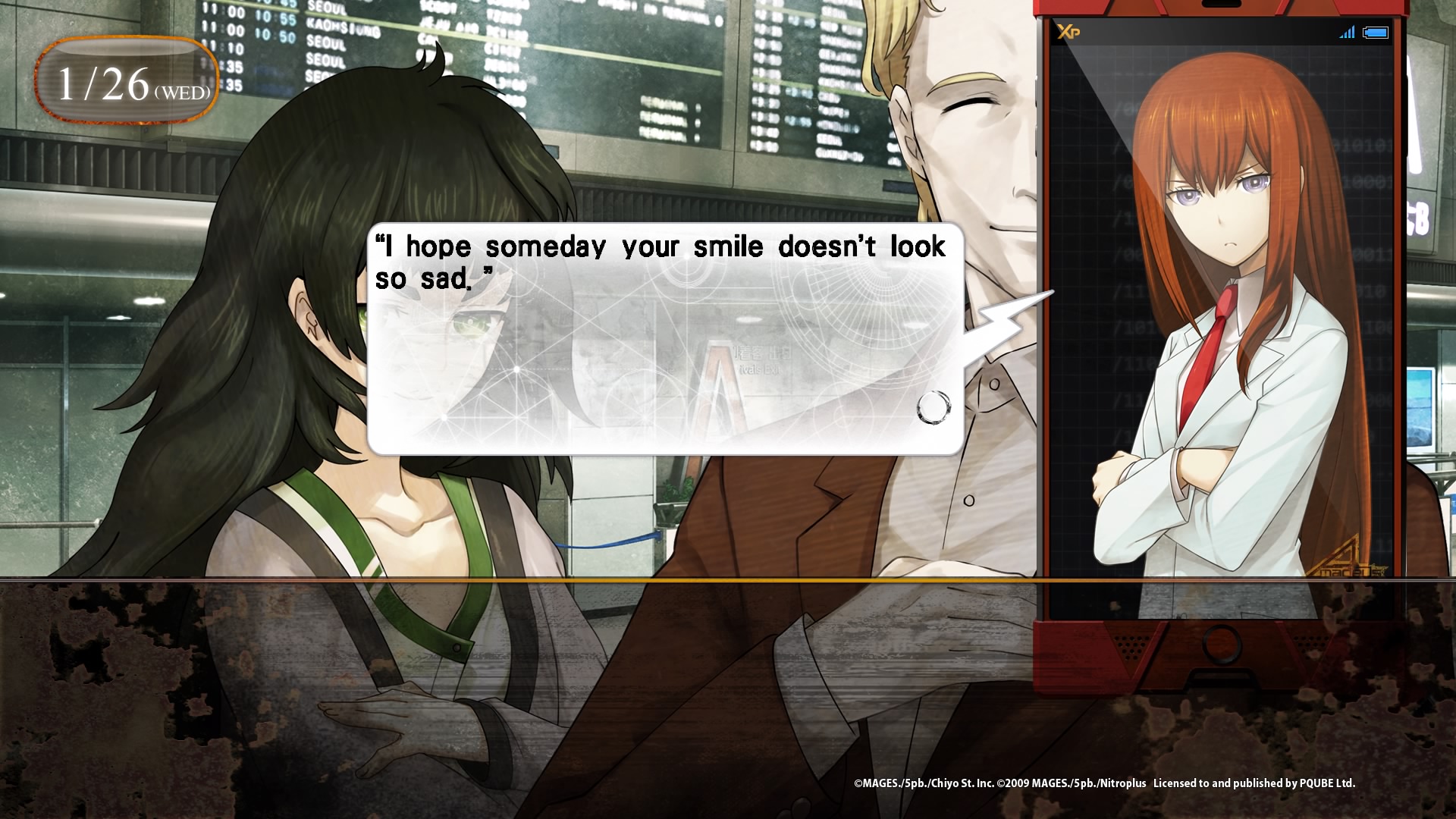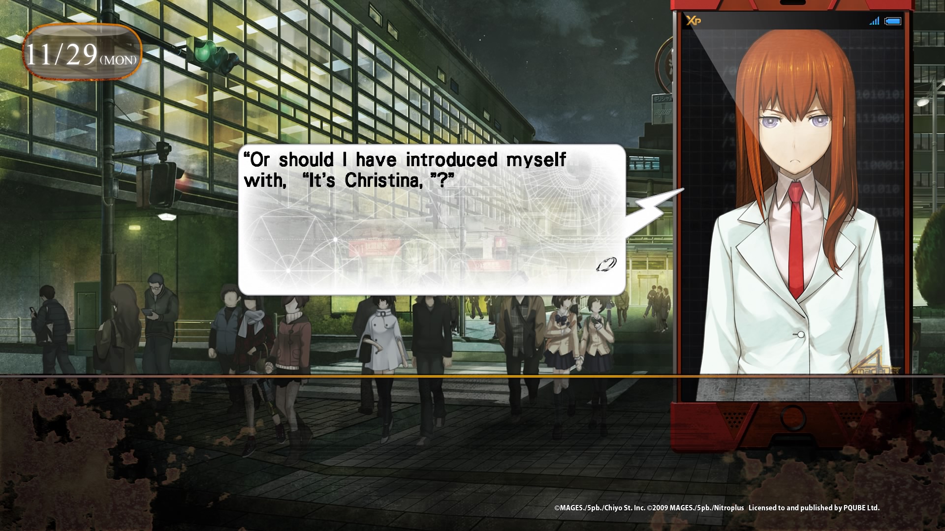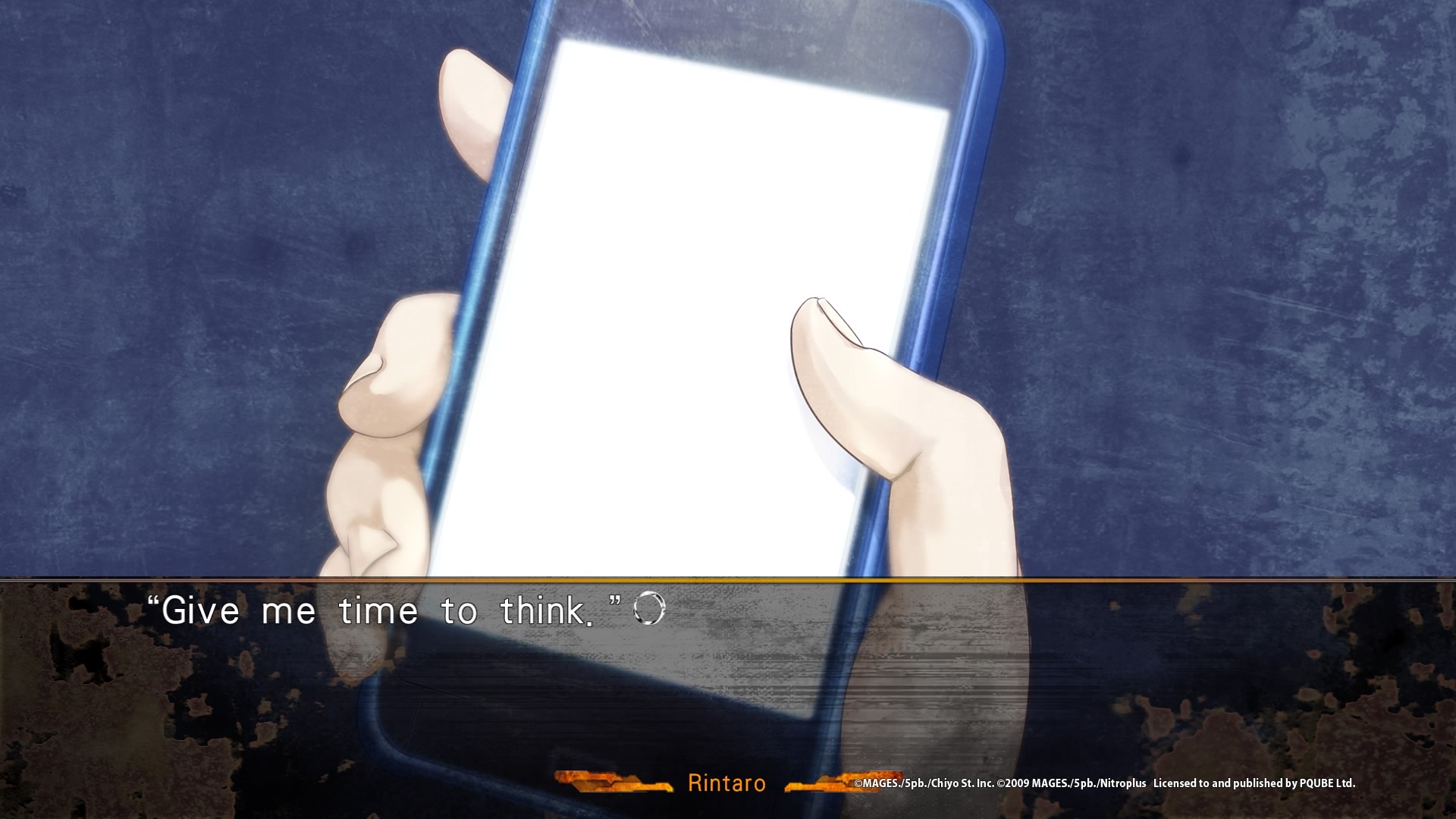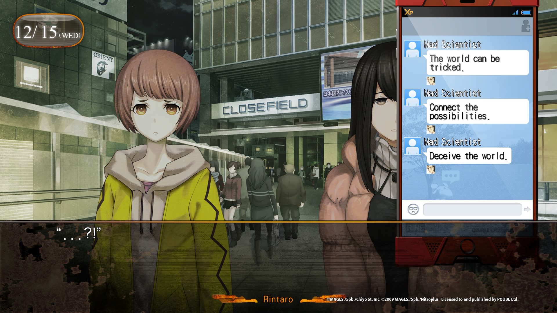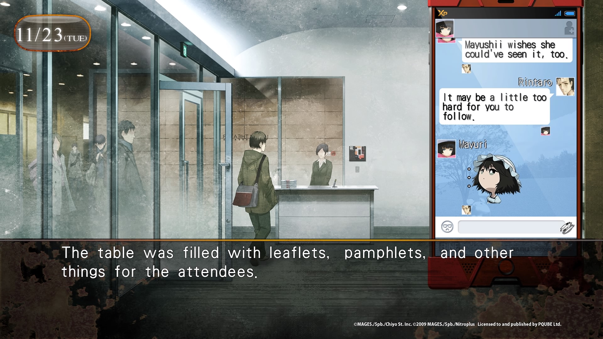 | Encore une fois, peu de gameplay, il s’agît d’un visual novel, et donc en grande partie de texte à lire. La seule vraie interraction sera notre téléphone portable, l’envoi de messages via l’application RINE, et appeler ou répondre aux appels d’Amadeus, qui améneront les différentes fins. |