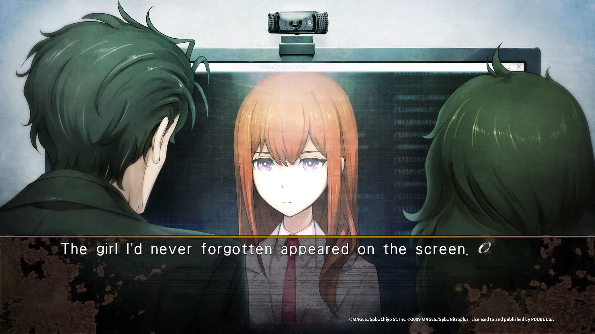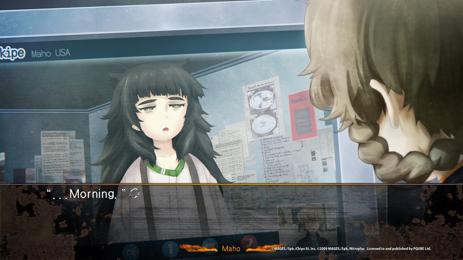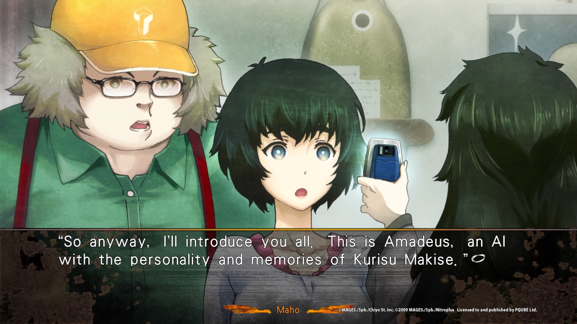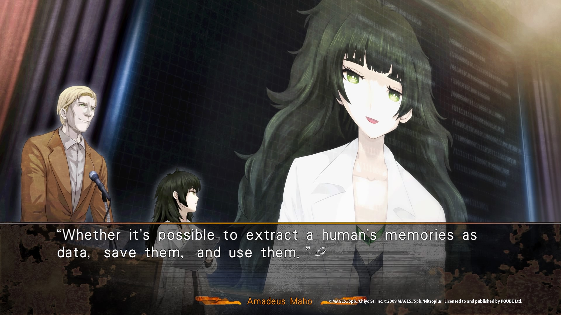 Steins;Gate 0, comme le premier jeu, est découpé en plusieurs chapitres, avec une introduction d’une heure environ pour nous mettre dans le bain et introduire en quelques mots les nouveaux enjeux. Dans cette introduction, nous nous familiarisons avec le nouveau téléphone d’Okabe, le nouveau système de réponse (on peut également envoyer des stickers maintenant), et nous découvrons les deux nouveaux personnages clés de cette intrigue, à savoir Maho, une jeune génie de 21 ans à l’apparence d’une ado, scientifique et assistant du professeur Leskinen, un grand homme travaillant en Amérique sur le cerveau. Deux nouveaux personnages amenant à la fin du prologue une révélation qui on s’en doute, va bouleverser Okabe. Il accepte en effet la proposition de devenir un testeur de leur programme Amadeus. Une fois sur place, il comprend immédiatement les enjeux et pourquoi, en tant que scientifiques, la présence d’Okabe peut leur apporter des éléments nouveaux. Amadeus est une intelligence artificielle développée à partir de la vraie mémoire et de l’apparence de … Makise Kurisu. Okabe va donc devoir parler à Kurisu, ou du moins une copie d’elle, aussi vraie que la vraie, ayant des réactions humaines comme celle qu’il connaissait. De quoi réveiller de vieux démons… La petite vie simple qu’Okabe voulait obtenir n’est pas là pour lui…