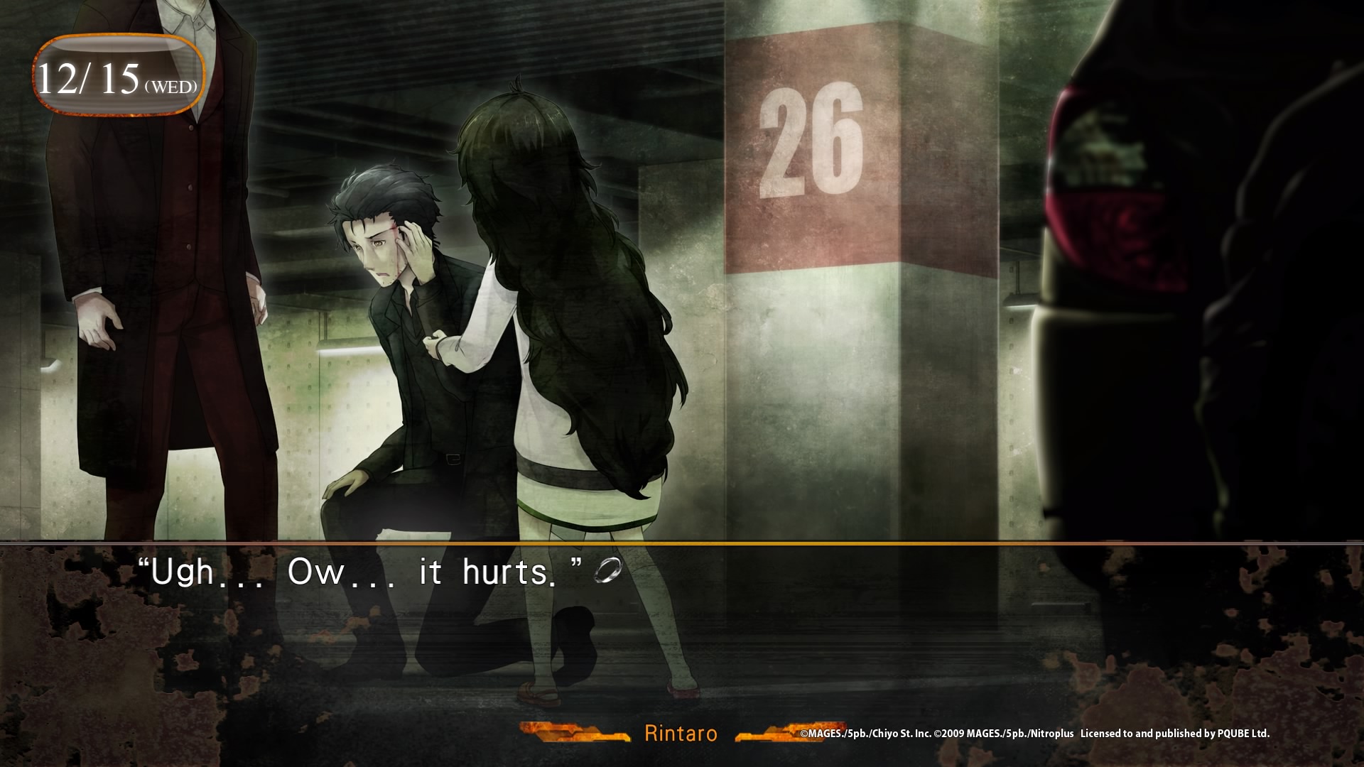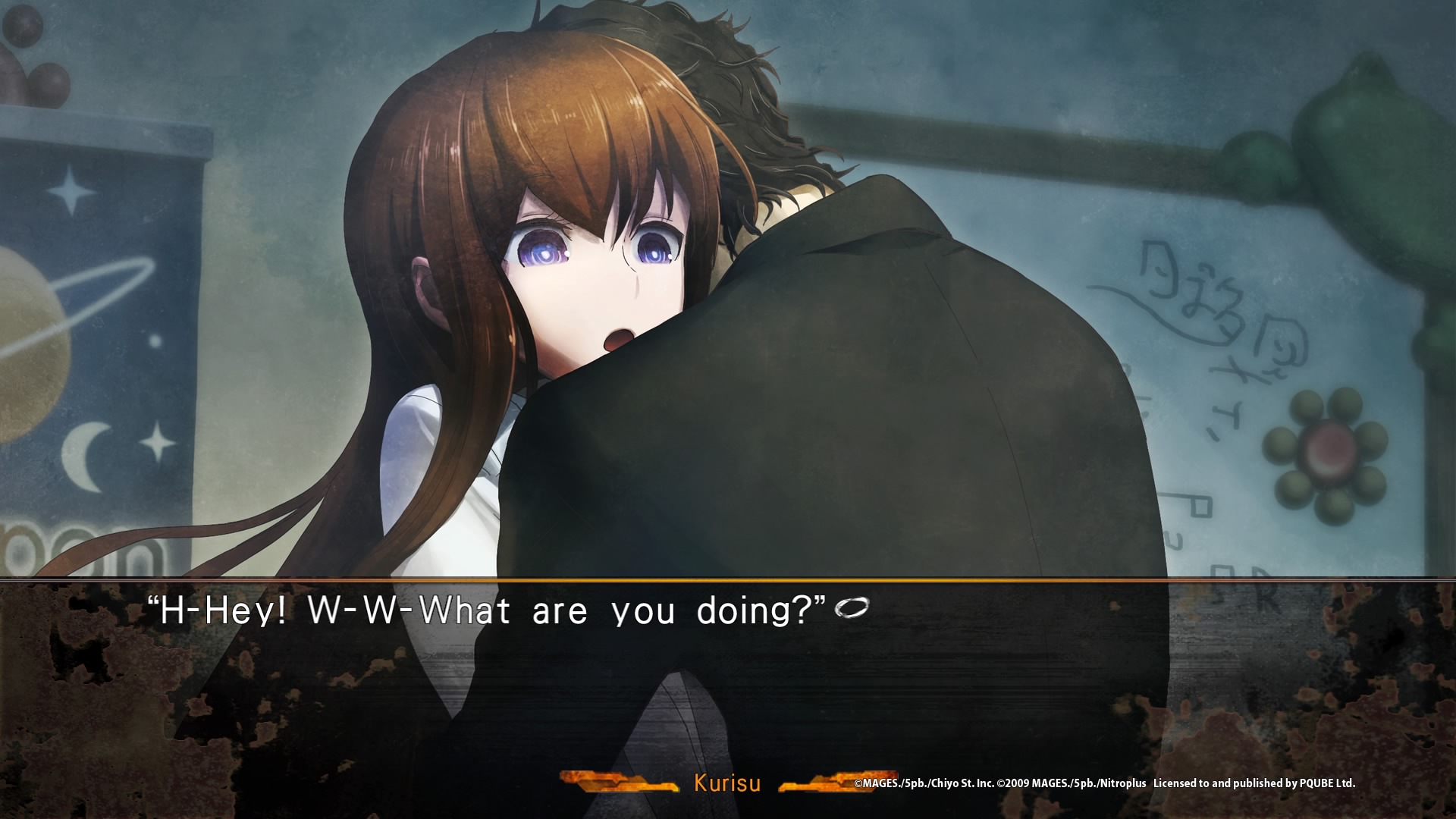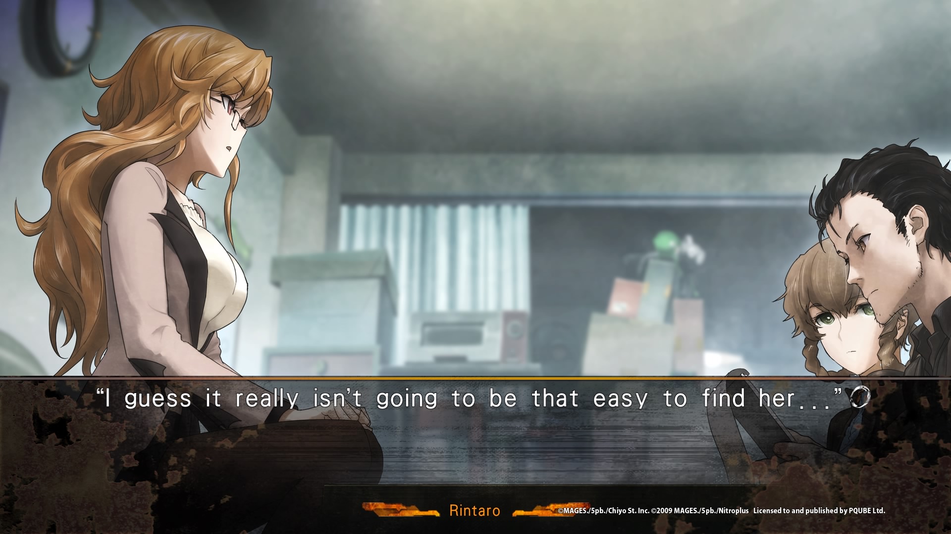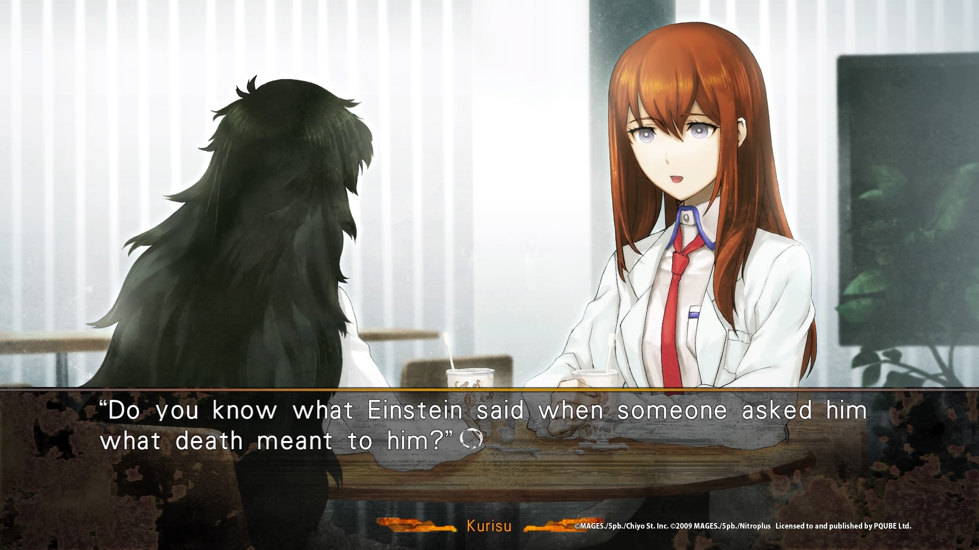 Sauf que Steins;Gate 0 ne reprend pas cette fin optimiste, joyeuse, logique et qui faisait bien plaisir. Non, Steins;Gate 0 se déroule sur la ligne de temps Beta, pas la ligne Steins;Gate. Les événements se déroulent donc après l’échec d’Okabe, jusqu’aux événements qui lui feront s’envoyer un message dans le passé pour sauver Kurisu au second essai. Oui, tout de suite, on s’en doute, Steins;Gate 0 sera un jeu sombre, beaucoup plus sombre que le premier opus. Nous découvrons un Okabe détruit, dévasté, s’isolant des autres, qui ira voir un psy, qui évitera totalement Suzuha insistant pour le renvoyer dans le passé, évitera de parler de Kurisu sous peine d’avoir des crises de panique, et ira jusqu’à changer de personnalité. Vous vous souveniez du Okabe blagueur qui voulait se faire appeler Houyin Kyouma ? Il n’est plus là. Okabe décide même dans un sens d’être un étudiant normal, de se focaliser sur ses études, de ne plus jamais remettre un pied dans son labo. Malgré tout, ses différentes expériences sur les différentes lignes de temps laissent encore plus de traces que prévu, et le simple fait de croiser certains personnages le mettra dans un sentiment de stress ou de peur, en sachant de quoi ceux-ci sont capables, tout en ignorant totalement dans ce monde-ci la nature de ses personnages.