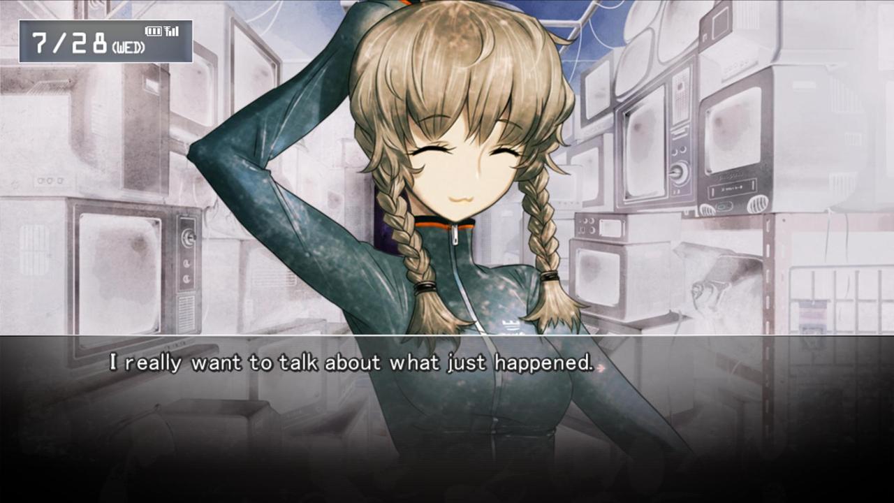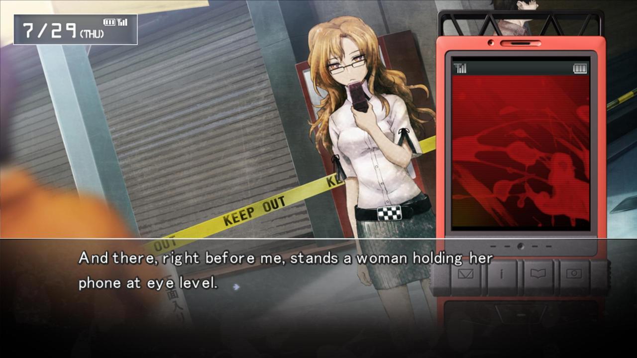 Il est rare de voir des visual novel débarquer en France, encore moins sur console. Steins ;Gate lui aura eu droit à cet honneur, tardivement certes, mais le voilà sur PC, X-Box 360, Playstation 3, PS Vita et même sur téléphone portable. Un visuel novel datant au départ de 2009, qui fut adapté en manga, puis en série animée de 24 épisodes. Et si l’on apprécie le genre, que lire des textes en anglais ne nous dérange pas, et que les sujets abordés nous intéressent, Steins ;Gate est une merveille malgré il est vrai quelques points noirs. Découpé en 11 chapitres suivant notre manière de jouer (nos choix peuvent très bien nous offrir une fin au bout du chapitre 7, et un simple petit élément rajoutera ou non le 11ème et dernier chapitre de la vraie fin), Steins ;Gate nous met dans la peau de Okabe Kintarô. Jeune de 18 ans vivant dans son laboratoire (amateur) situé au dessus d’une boutique de télé, il passe ses journées dans ses fantasmes de scientifique fou. Entre sa paranoïa, sa pseudo schizophrénie et les propos qu’ils invente clairement devant les autres, nous avons là un personnage haut en couleur. À ses côtés, deux autres membres de son labo, son amie d’enfance Mayuri qui au final ne sert pas à grand-chose (à moins que) et son ami Daru, otaku, pervers, et pro en informatique. D’autres personnages rejoindront l’aventure bien entendu. Le jeu nous balance sans véritable présentation dans le vif du sujet avec un prologue d’une heure qui nous permet de nous rendre compte du soin apporté à l’œuvre.