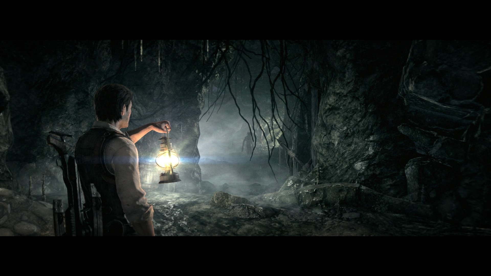 On joue donc ici un détective qui va peu à peu sombrer dans la folie la plus totale. Tout comme lorsque l’on est appelé (nous = Sebastian) à se rendre avec deux équipiers dans un hôpital psychiatrique où la situation a semble-t-elle dégénérée. L’hôpital fera donc office de prologue et surtout de tutorial, pour apprendre les contrôles du jeu, mais également se faire à certains de ses choix. Car dans Evil Within, le joueur se retrouve constamment à jouer avec des bandes noires en haut et en bas de l’écran. Si ce choix peut s’expliquer de plusieurs manières relativement simples, comme celui de vouloir donner un aspect plus cinématographique au jeu, ou tout simplement afin d’empêcher les baisses de framerate que le moteur du jeu aurait dû occasionner, il faudra un petit temps d’adaptation au joueur, surtout lorsqu’il se retrouvera dans une toute petite pièce. Le moteur graphique donc, parlons en ! Celui-ci s’avère par moment assez inégal, nous balançant à la gueule parfois des images sublimes avec des effets de lumière parfaitement gérés, puis l’instant suivant des textures beaucoup plus discutables. Les lieux extérieurs seront les plus frappés par ce contraste. Avancer dans une forêt, si l’on prête attention au détail, pourra faire crisser des dents en voyant la modélisation des arbres et de certains éléments de la végétation, alors que les branches bougeant au vent et les feuilles mortes tombant des arbres sont fabuleux !